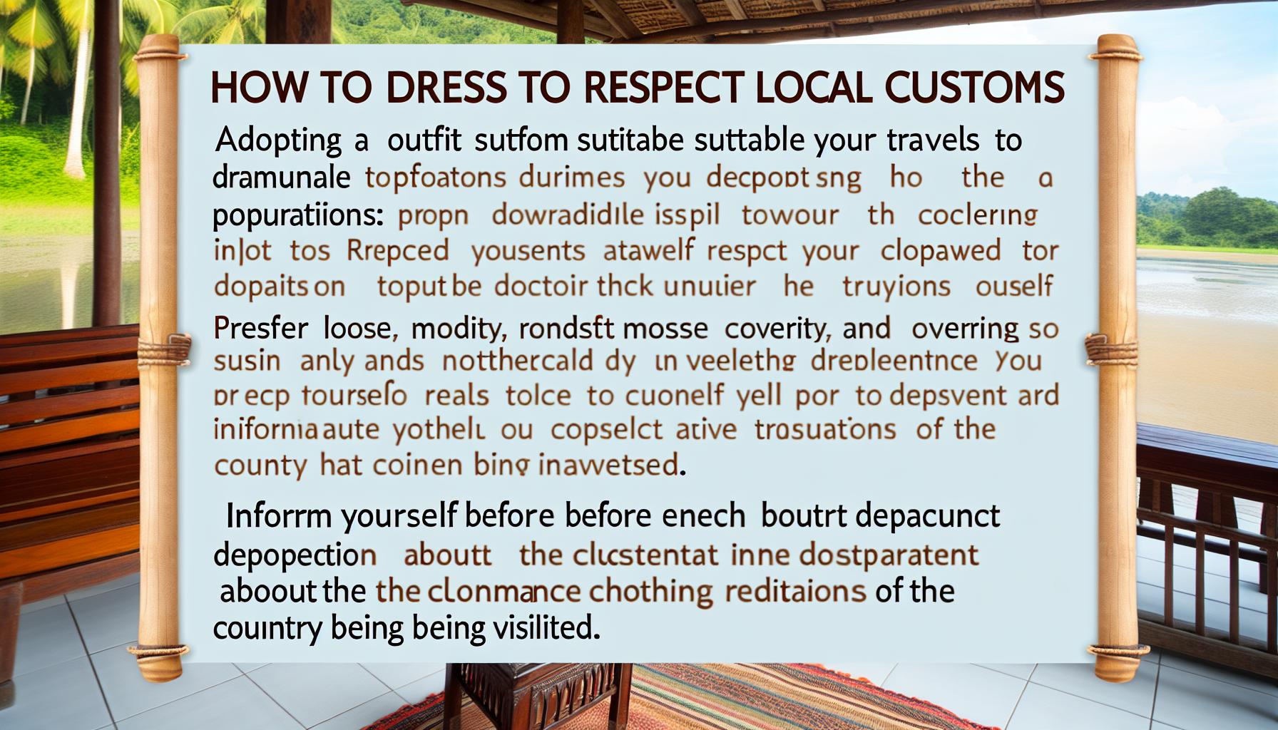 Finally, consider respecting traditional colours and materials in order to better integrate and avoid any false cultural steps. By following these steps, you will enjoy your stay without compromising your comfort or your respect for local habits.